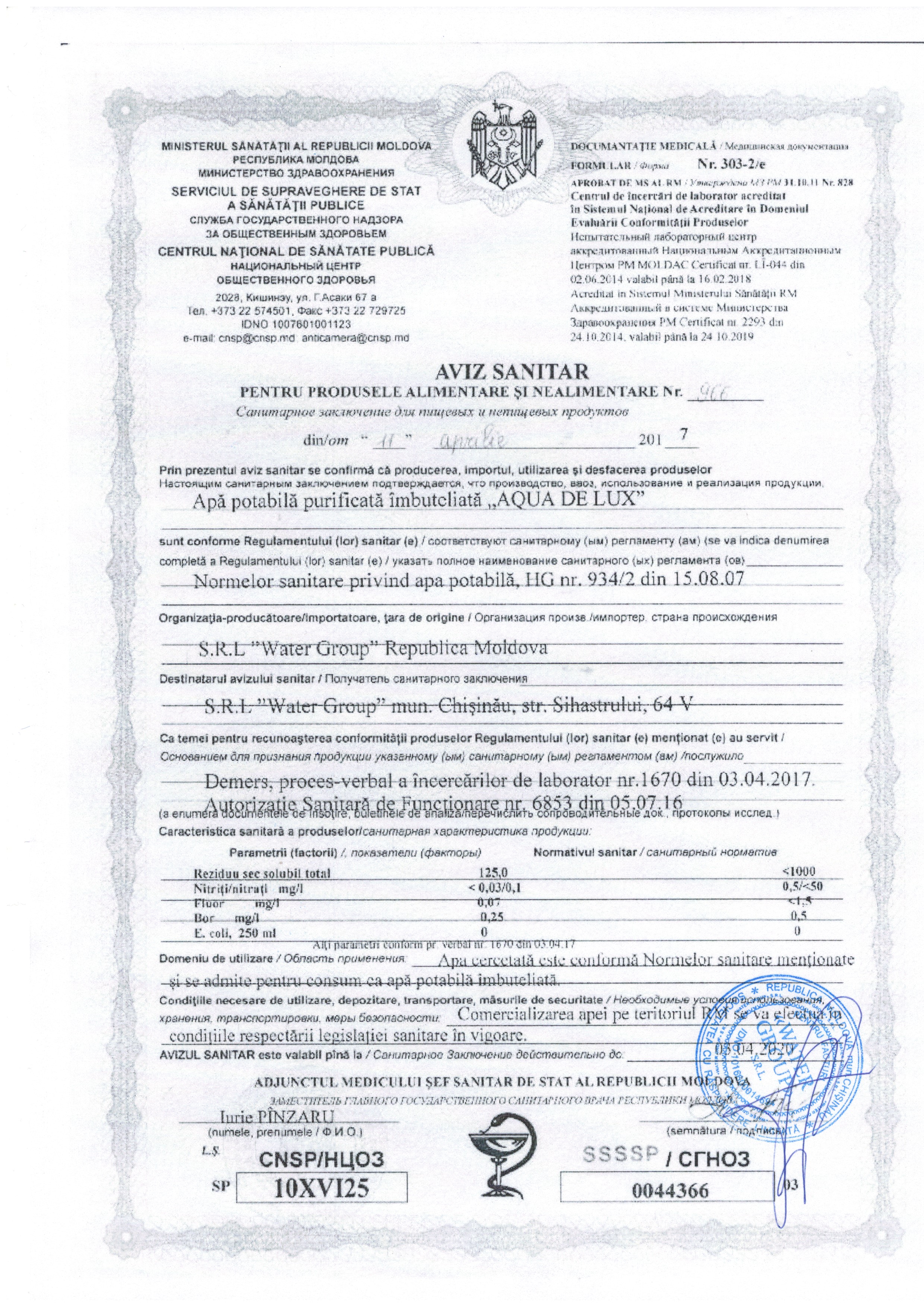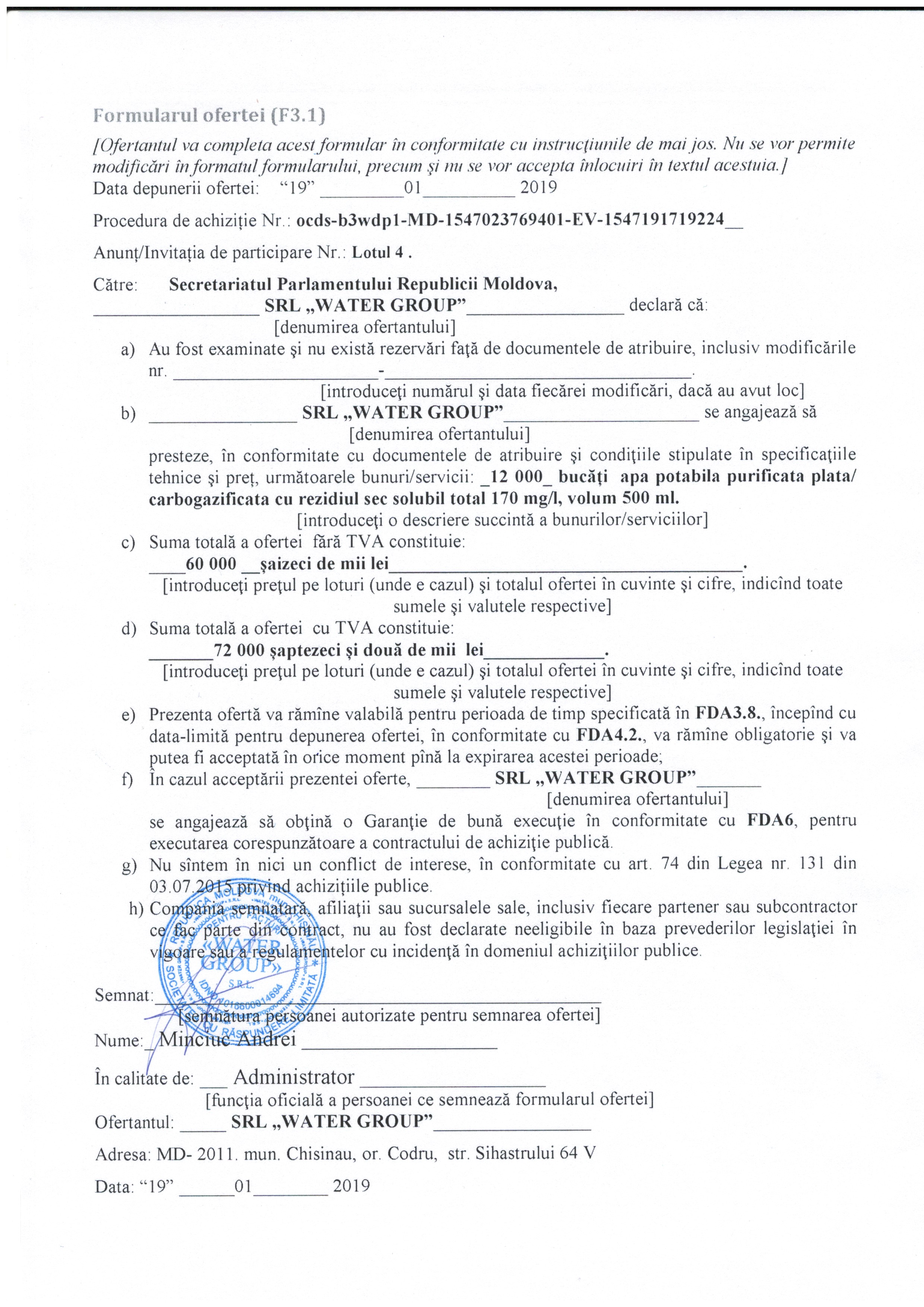 Reason: Operatorul economic ,,Water Group” S.R.L. a depus oferta cu cel mai mic preț și cerințele tehnice conform anunțului de participare.
