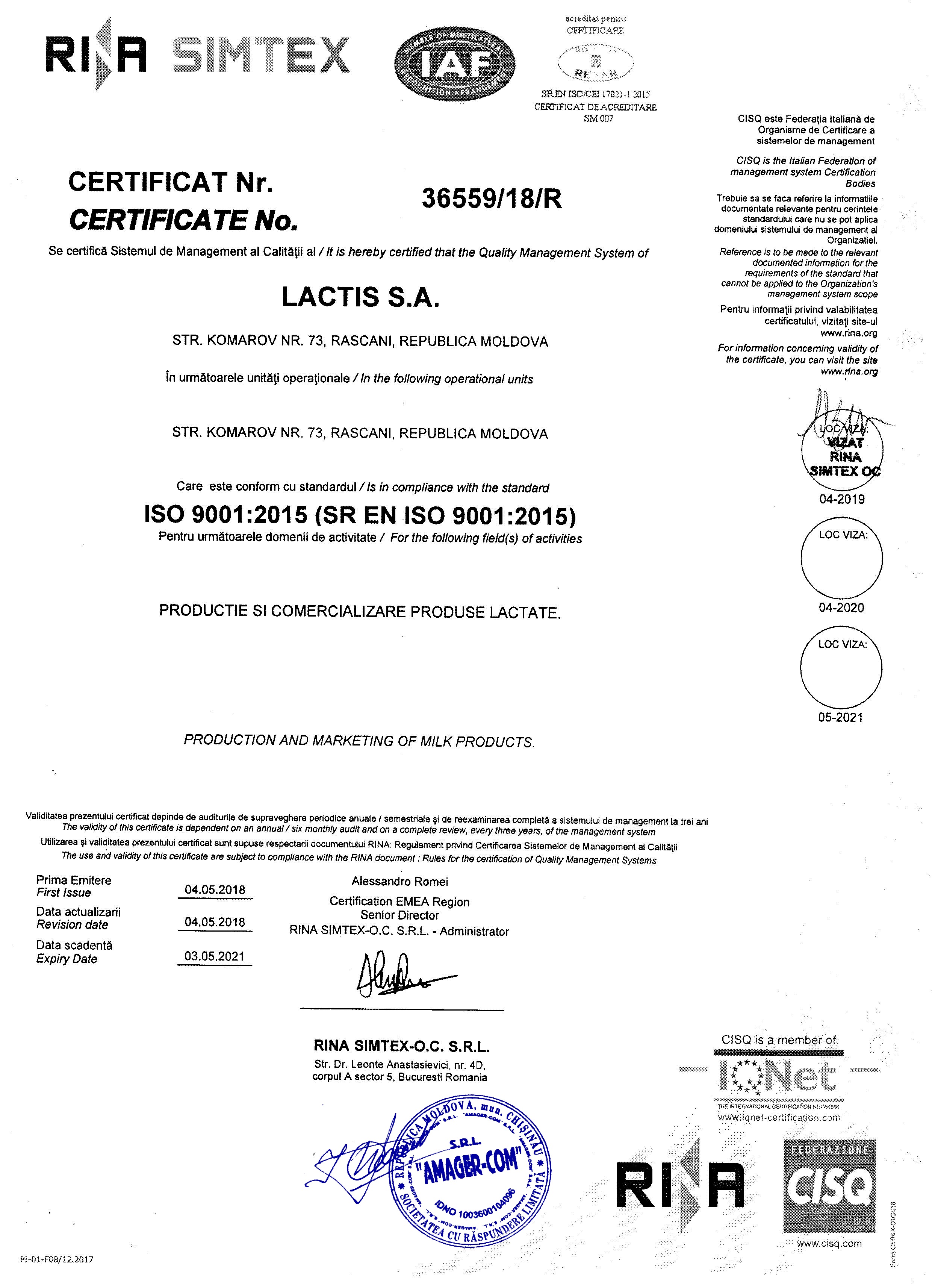 Ambalat în pachet de polietilenă 1litru Se livrează cu transport special pentru lactate, cu regim termic special Standard: HG nr. 611 din 05.07.2010 Acte ce denota calitatea produsului: -Declarația/certificatul de conformitate eliberat de organul Național de Verificare; Contract pentru executarea investigațiilor de laborator; Certificat sanitar-veterinar.