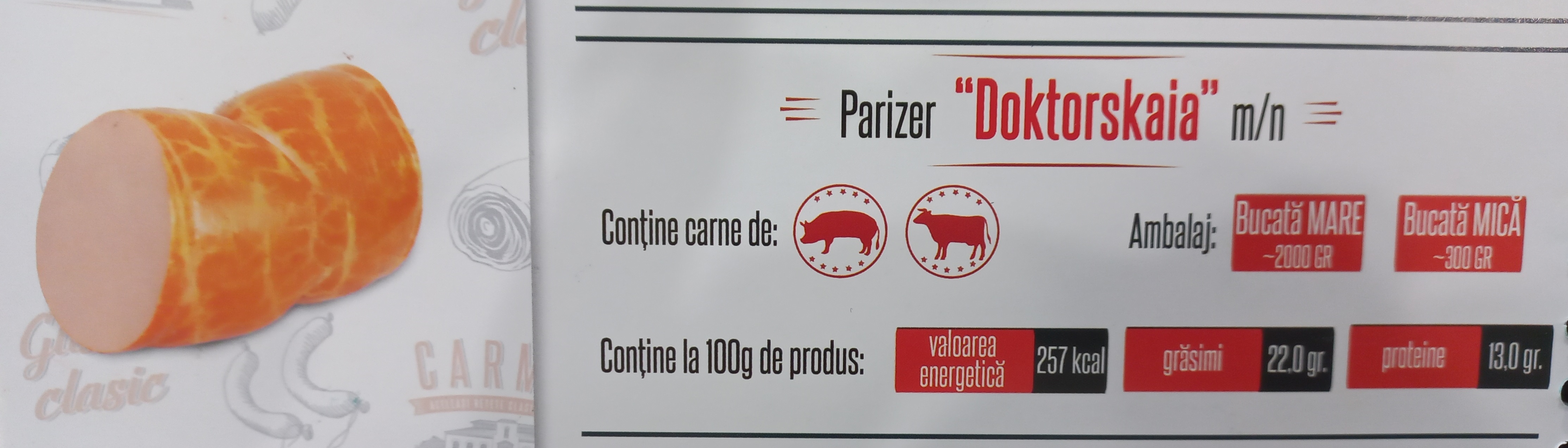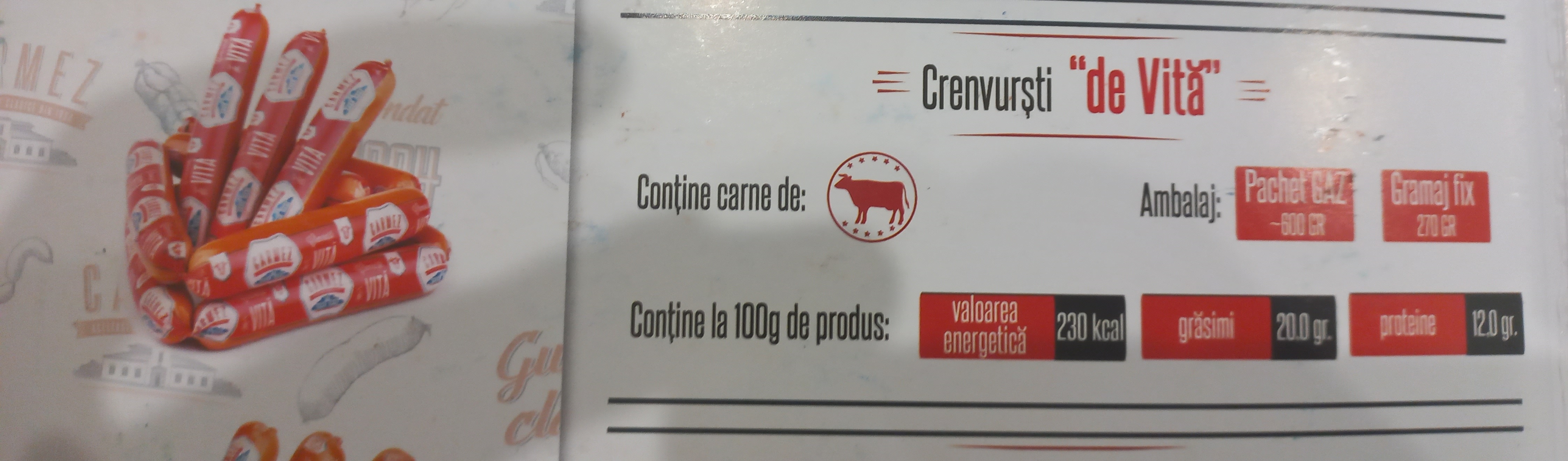 Crenvuște din carne de vită, fie care crenvușcă să fie ambalată cu membrană artificială în mod lanț, cu marcarea pe ea denumirea producătorului. c/s