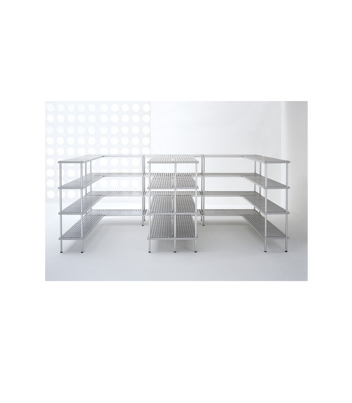 Raft cu 4 polite Polite perforate polietilena reglabile, suporturile din alumimiu RA18/136, dimensiuni 1300x600x1800.