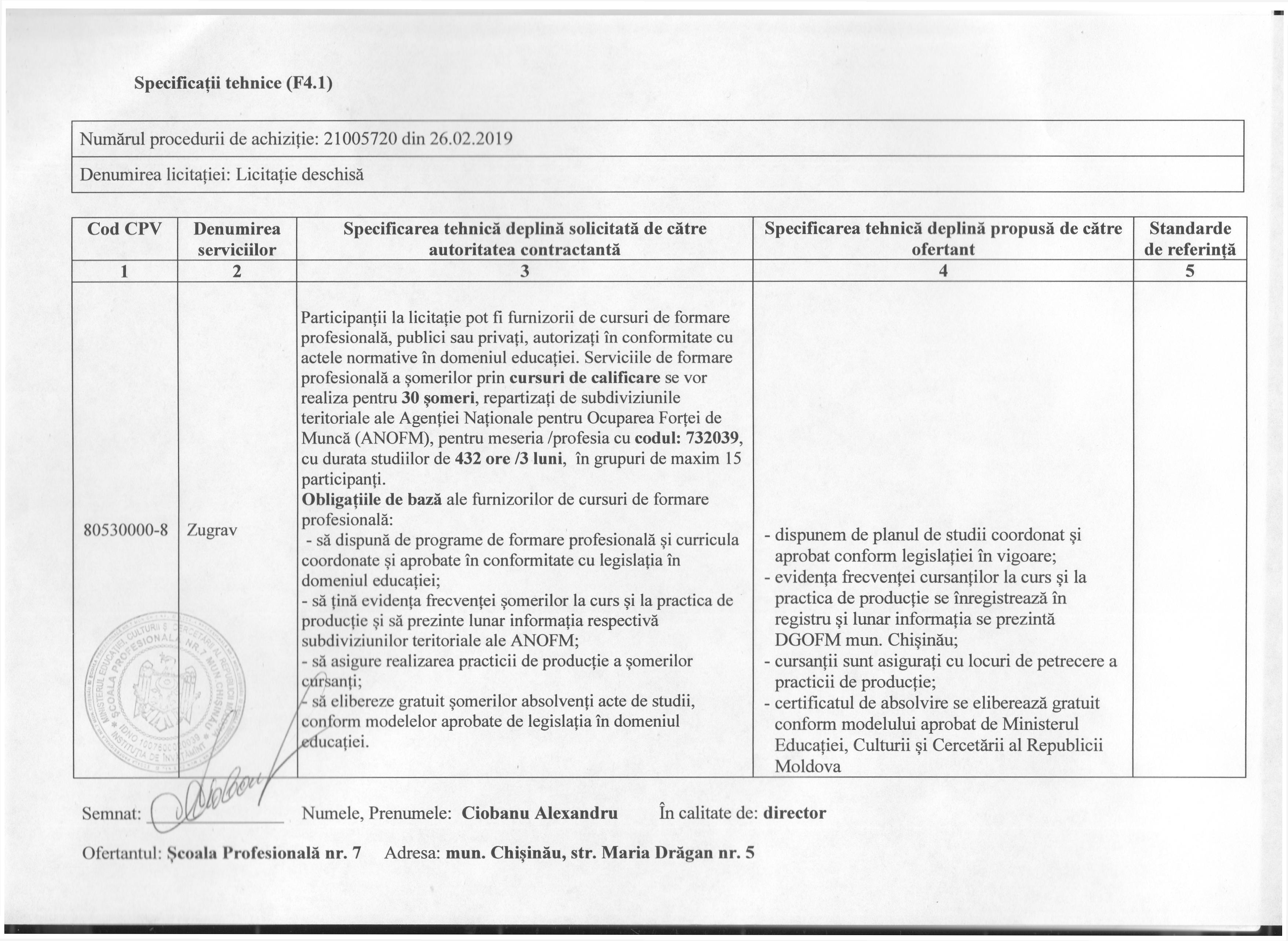 Participanții la licitație pot fi furnizorii de cursuri de formare profesională, publici sau privați, autorizați în conformitate cu actele normative în domeniul educației. Serviciile de formare profesională a șomerilor prin cursuri de calificare se vor realiza pentru 30 șomeri, repartizați de subdiviziunile teritoriale ale Agenției Naționale pentru Ocuparea Forței de Muncă (ANOFM), pentru meseria /profesia cu codul: 732039, cu durata studiilor de 432 ore /3 luni, în grupuri de maxim 15 participanți.