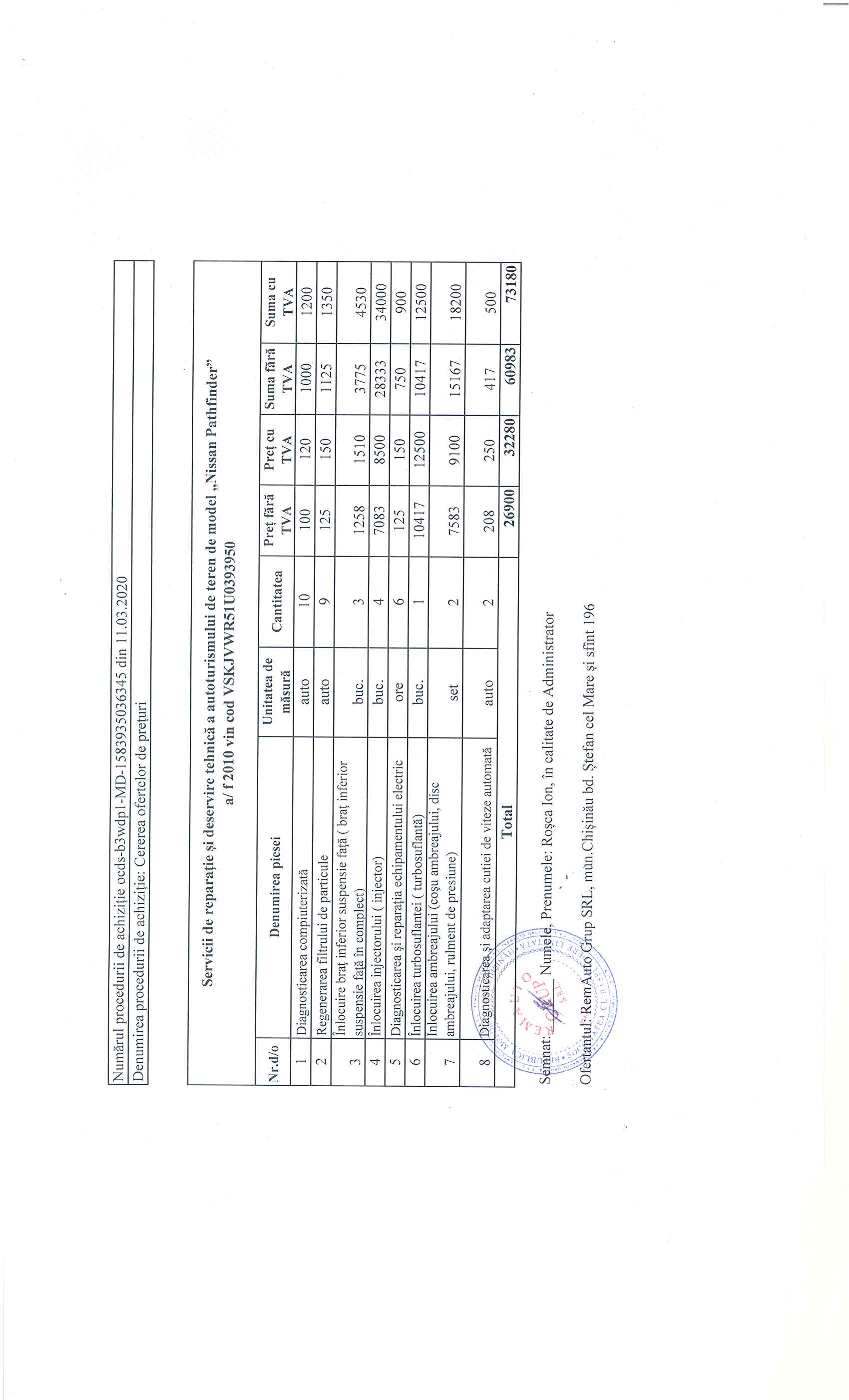 Servicii de reparaţie şi deservire tehnică a autoturismului de teren de model „Nissan Pathfinder” a/ f 2010 vin cod VSKJVWR51U0393950