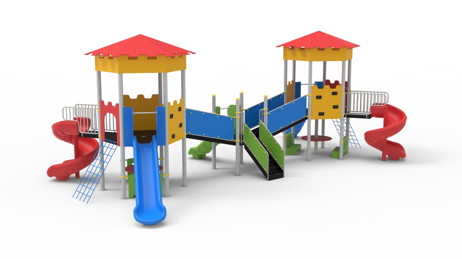 Constructia va fi constituita din 2 turnuri hexagonal сu acoperis, turn simplu, 2 tobogane mare drept, tobogan drept, 2 tobogane spirale, 2 balconuri cu balustrade, scara, 2 podețuri cu balustrade de tip “val” cu elemente decorative, 2 masute cu scaune incorporate. Constructia va fi constituita din piloni de sprijin realizati din teava din otel cu diametrul de cel puțin 76mm, grosime minima - 3mm. Podeaua turnurilor hexagonale urmeaza a fi de forma rotunda cu diametrul minim de 1340 mm, fiind confecționat din HDPE – polietilena de inalta densitate fara component toxice cu structura multistrat de diverse culori cu grosimea nu mai putin de 15 mm. Podeau turnului simplu si balcoanelor va fi de forma rotunda cu diametrul minim de 930 mm și trecerea dintre acestea fiind confecționata din HDPE – polietilena de inalta densitate fara component toxice cu structura multistrat de diverse culori cu grosimea nu mai putin de 15 mm. Scara va detine trepte și balustrade pentru ascensiunea în condiții de siguranță spre platformă. Treptele scarii nu trebuie să fie alunecoase. Suporturile laterale pentru fixarea treptelor trebuie sa fie confectionate din HDPE – polietilena de inalta densitate fara component toxice cu structura multistrat de diverse culori cu grosimea nu mai putin de 15 mm. Masute cu scaunele incorporate sub turnuri hexagonale vor fi confectionate din HDPE – polietilena de inalta densitate fara component toxice cu structura multistrat de diverse culori cu grosimea nu mai putin de 15mm. Toboganele trebuie să dețină: - zona de pornire cu bară de protecție, care va determina copilul să se așeze, fixat pe elementele de protecție laterale, realizate din HDPE (polietilena de inalta densitate fara component toxice cu structura multistrat de diverse culori), cu înălțimea minima de 450 mm si cu grosimea de cel putin 15 mm; - zona de accelerare; - porțiune de frînare. In scopul excluderii traumării copiilor, toboganele vor detine bordure în ambele parti cu înălțimea minima de 120 mm. Toboganele vor fi realizate din polietelena LLDPE prin tehnologia “rotomoulding”. Balustradele trecerii - înălțime de minim 700 mm, teava acestora - secțiune de cel puțin 33 mm. Balusradele trecerii si panelele turnului hexagonal vor dispune de elemente decorative din HDPE – polietilena de inalta densitate fara component toxice cu structura multistrat de diverse culori cu grosimea nu mai putin de 10mm. Acoperis si panelele turnului hexagonal urmeaza a fi din HDPE – polietilena de inalta densitate fara component toxice cu structura multistrat de diverse culori, cu grosimea de cel putin 10 mm. Pentru a evita pătrunderea apei provenite din precipitaţii, pilonii sunt acoperiţi cu capace de plastic. Elementele metalice necesita a fi ansamblate și vopsite in camp electrostatic, în două straturi cu grosimea minima 100 microni pentru a le conferi rezistentă la mediul exterior. Materiale: otel, HDPE, plastic, cauciuc, LLDPE. Caracteristici tehnice. Dimensiuni generale ale constructiei, nu mai putin de: Lungimea – 8200 mm, lăţimea – 5700 mm, înălţimea – 3550 mm. Inălţimea platformelor de la sol: nivel 1 – 1000 mm, nivel 2 – 1500 mm, nivel 3 – 1500 mm. Fundatia constructiei va avea dimensiuni minime de Lxlxh=400x400x700 mm. Cerințe pentru instalare: Pentru asigurarea funcționării sigure și fiabile, toate elementele de sprijin urmeaza a fi adâncite în sol (pămînt) nu mai puțin de 0,70m pentru a crește rigiditatea, apoi urmînd procesul de betonare (beton BC 300). Montarea elementelor trebuie să excludă posibilitatea dezasamblarii lor, fără utilizarea instrumentelor cu destinație specială.